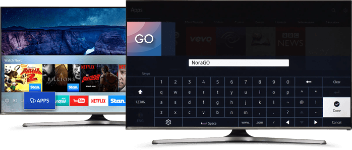 Downloading the NoraGO App for Samsung Smart TV can be done in the App Store for different Samsung TV models.
